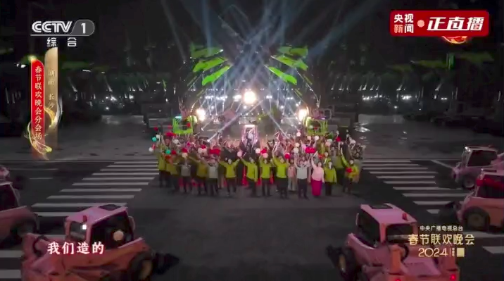 在央視龍年春晚的節目中,中聯重科作為中國裝備制造企業代表閃耀亮相,總數達數百臺的泵車、起重機、挖掘機、高空作業平臺展臂林立、依次排開,帶來濃濃的科技感和機械感。高空作業平臺和滑移裝載機的燃情助演,以及中聯重科員工一句“這里做得蠻好的嘛”和“我們造的”,讓人熱血澎湃。這些匠心獨運的內容編創,融合科技感和藝術感的視覺呈現,讓工業、機械之美與歌舞之美完美融合,彰顯了中國先進裝備制造企業昂揚向上、極致奮進的積極形象。