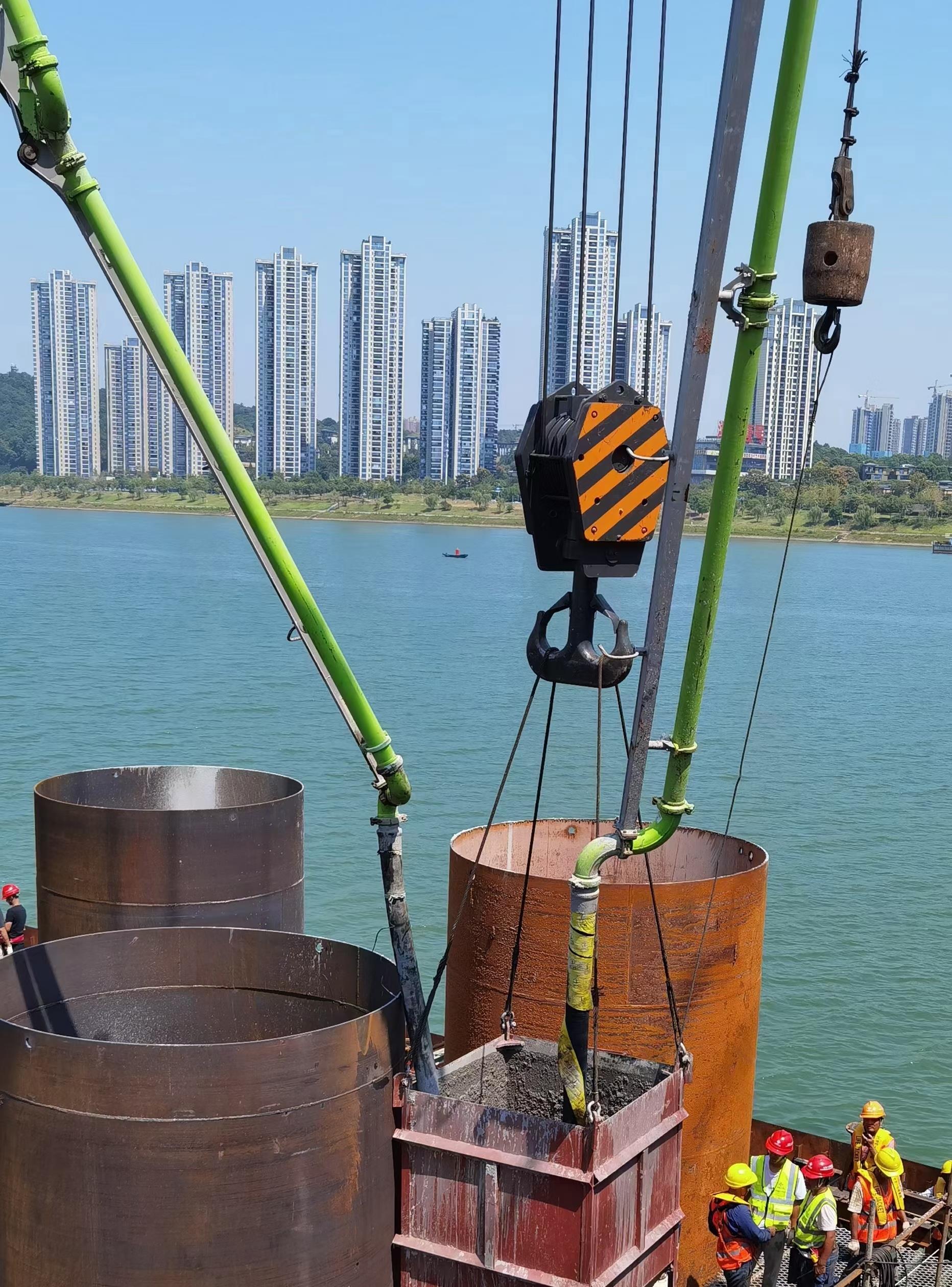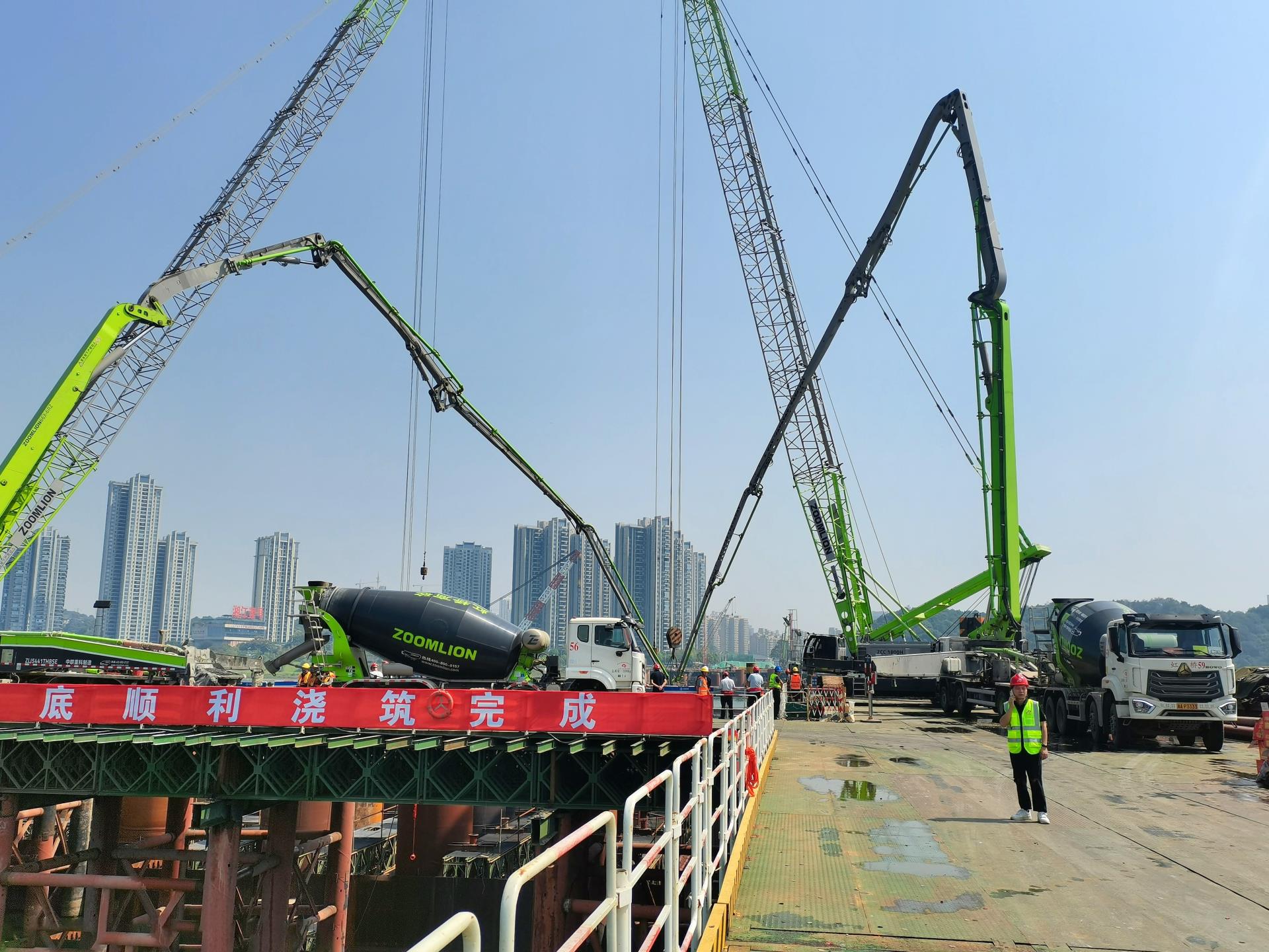 其主墩承臺設(shè)計為深埋式“啞鈴型”,鋼圍堰封底工作是**關(guān)鍵、也是連續(xù)作業(yè)時間**長的工序。為確保澆筑品質(zhì)和效率,施工方經(jīng)多方對比,**終選擇了中聯(lián)重科“凌云”系列泵車來完成任務(wù)。操作機手也對中聯(lián)重科的泵車情有獨鐘:“中聯(lián)的泵車臂架一直都很穩(wěn),打料快、油耗也低!”
