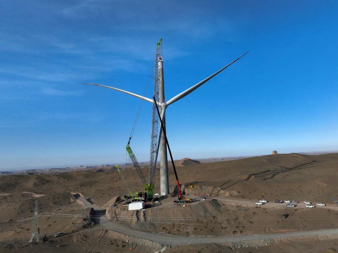 起吊、提升、精準對接……近日,在有著“中國**美的沙漠”之稱的巴丹吉林沙漠南緣的甘肅高臺縣北部灘40萬千瓦風電項目基地,來自中聯重科的ZCC11800履帶起重機成功吊裝了項目首臺120米混塔,助力該項目建設又一次取得實質性突破。