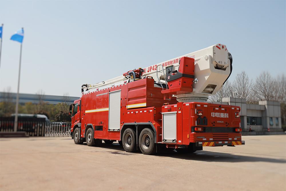 中聯重科42米三相射流舉高噴射消防車是集高噴、水罐、泡沫、干粉多功能于一體的新型高效滅火裝備。